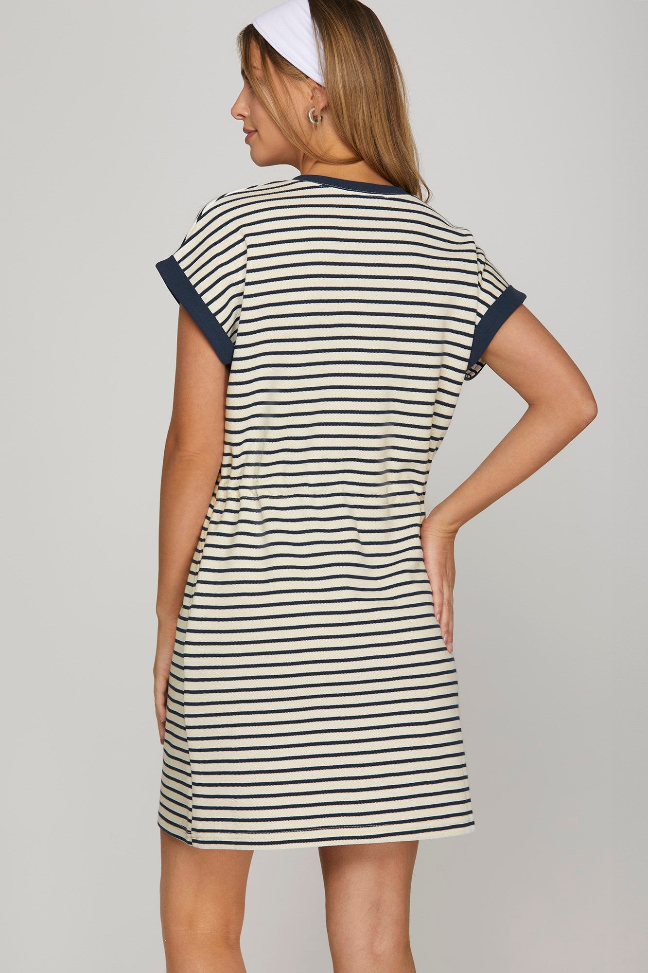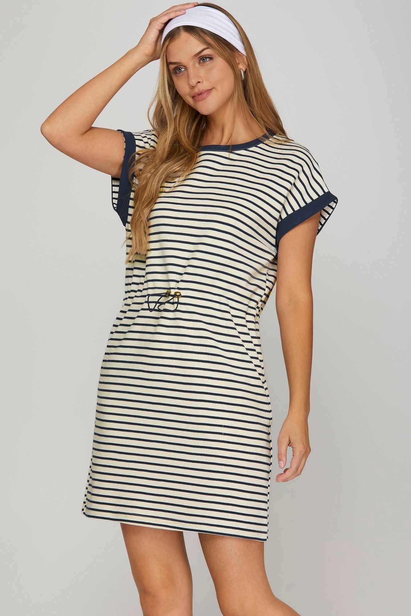 The Serena Striped Tennis Dress offers a perfect blend of comfort and casual style. Its cap sleeve design and breathable knit fabric keep you cool, while the waist tunnel elastic provides a flattering fit. Pockets add practical convenience, making this mini dress ideal for both active days and relaxed outings.