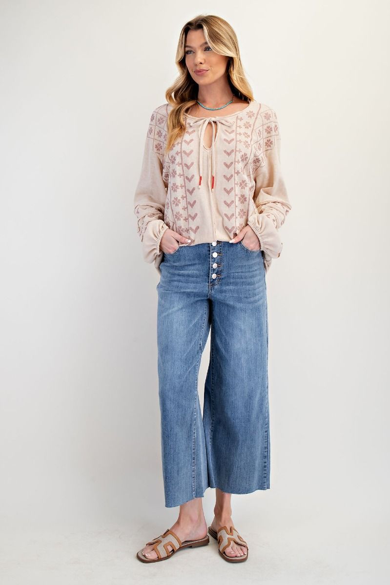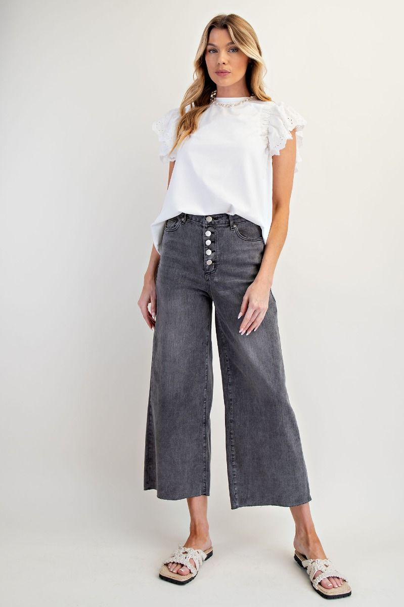 Step into the Relaxed Crop Wide Leg Denim Pant for a blend of comfort and bold style. These high-waisted pants feature a distinctive five-button front closure and offer a wide leg silhouette that moves with you. With front and back pockets and a raw hem finish, they combine functionality with a laid-back, modern vibe. Crafted from washed stretch denim, they’re perfect for everyday Fall wear, with your favorite booties.