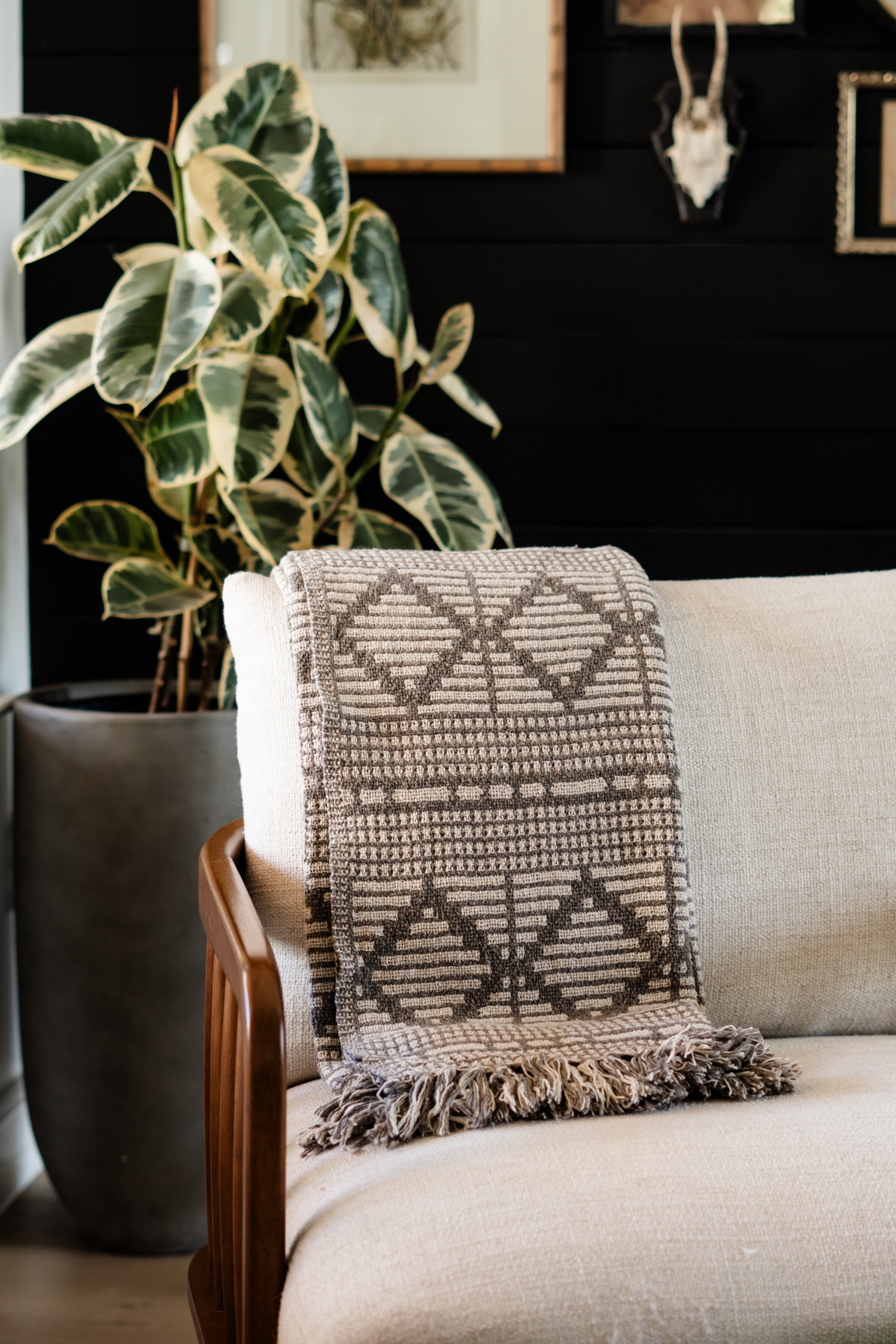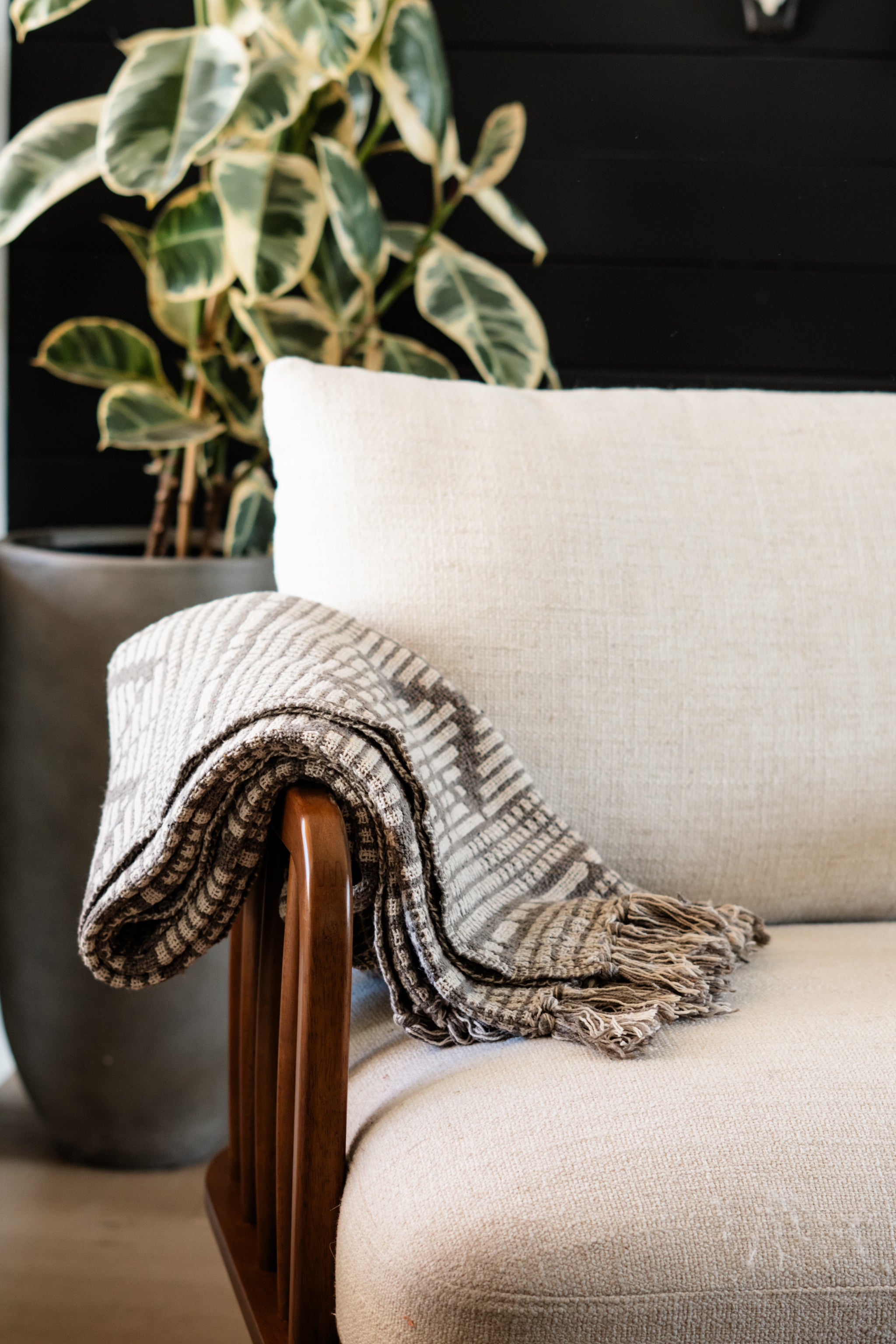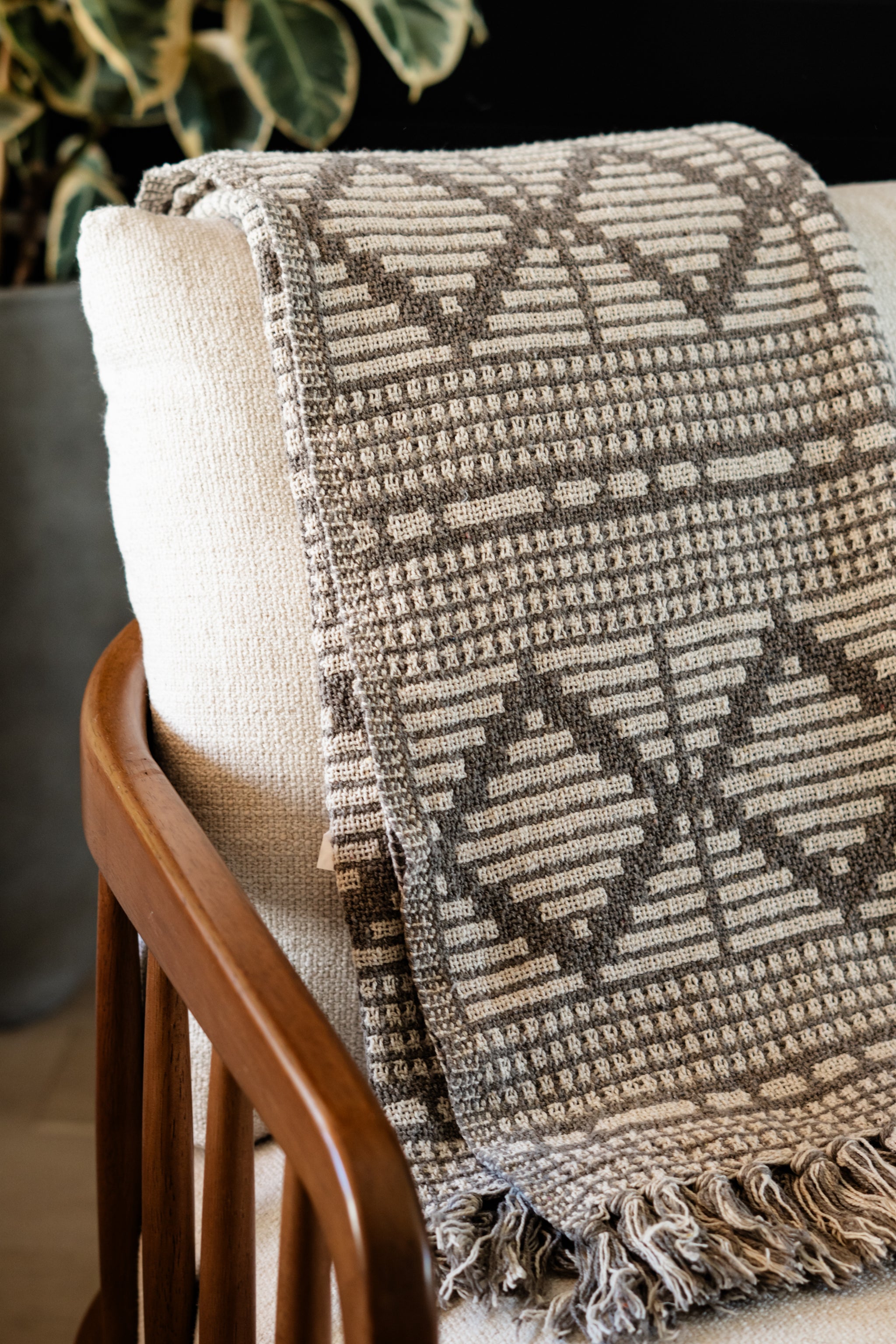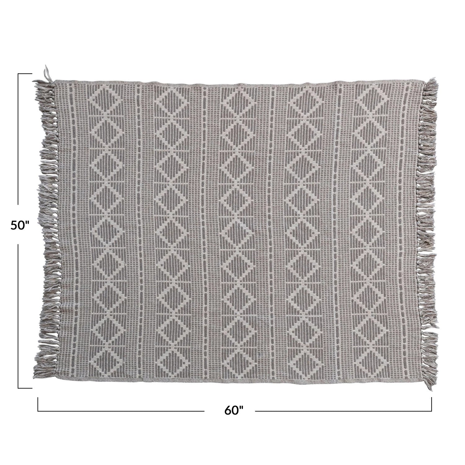 This cream colored Recycled Cotton Blend Printed Throw is a lightweight addition to any piece of furniture needing a touch of softness. The fringes are fun and stylish, while the diamond pattern gives this throw a more natural and native feel. The black and beige unique design that will blend in with most furniture's and wall colors. This throw can be machine-washed. 60"L x 50"W Woven Recycled Cotton Blend Throw.