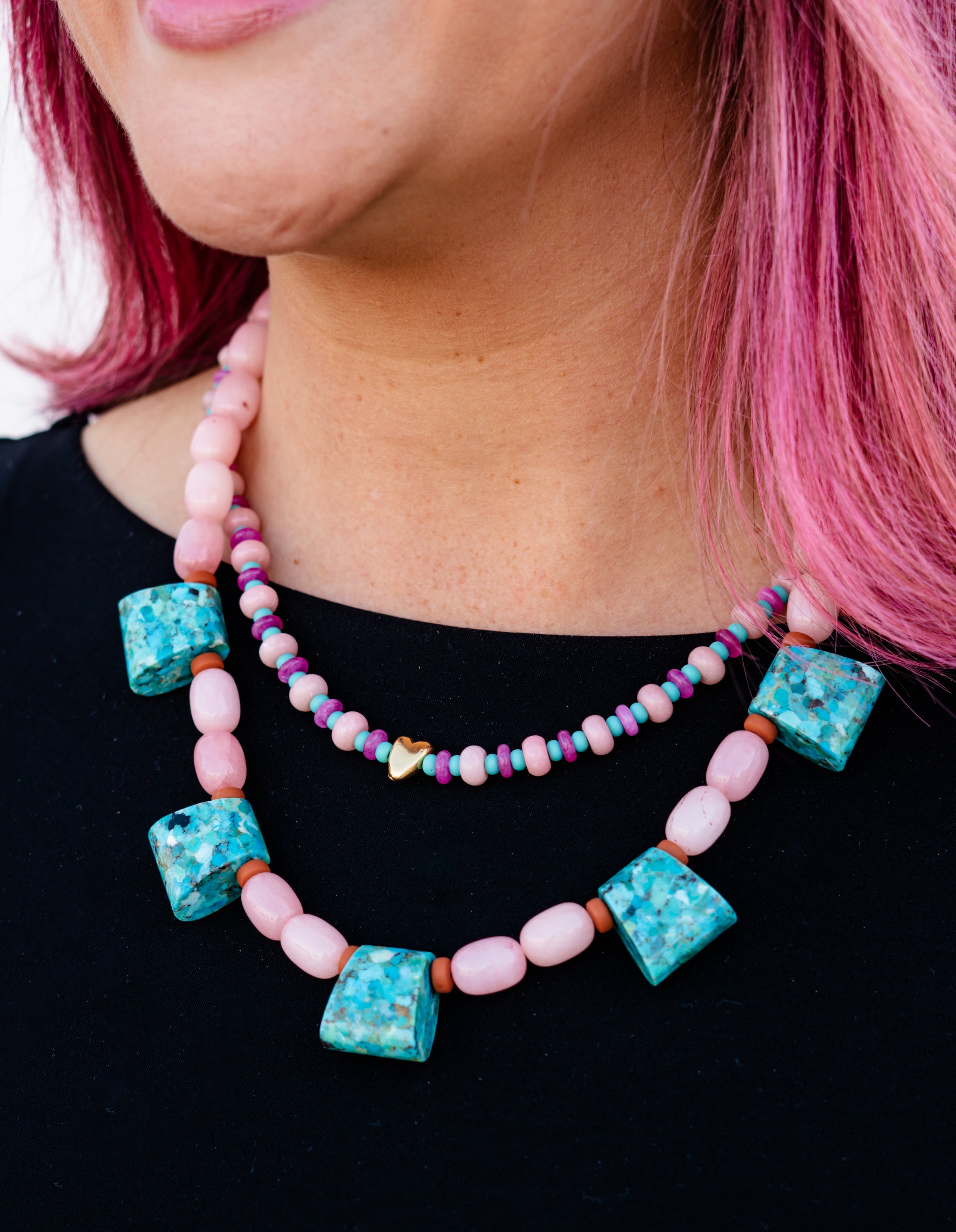 Gold heart mixed with pink opal and Ethiopian teal and fuchsia spacers. Measures approximately 18" long.