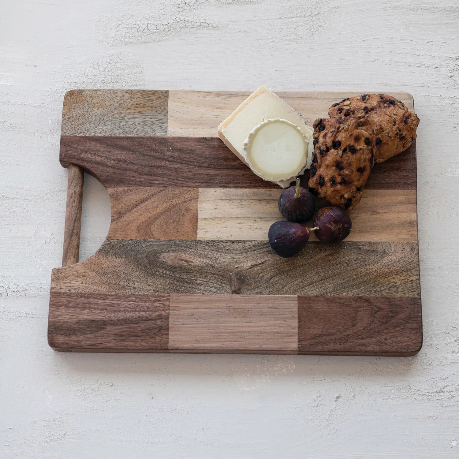 This Acacia, Pine & Mango Wood End Grain Cheese and Serving Board combines durability and natural beauty in one. Measuring 15-3/4"L x 11-3/4"W, it features a convenient handle for easy serving. Crafted from a blend of rich woods, it offers a sturdy surface perfect for cutting, slicing, or presenting cheese and appetizers. Its natural finish enhances any table setting, making entertaining both simple and stylish.