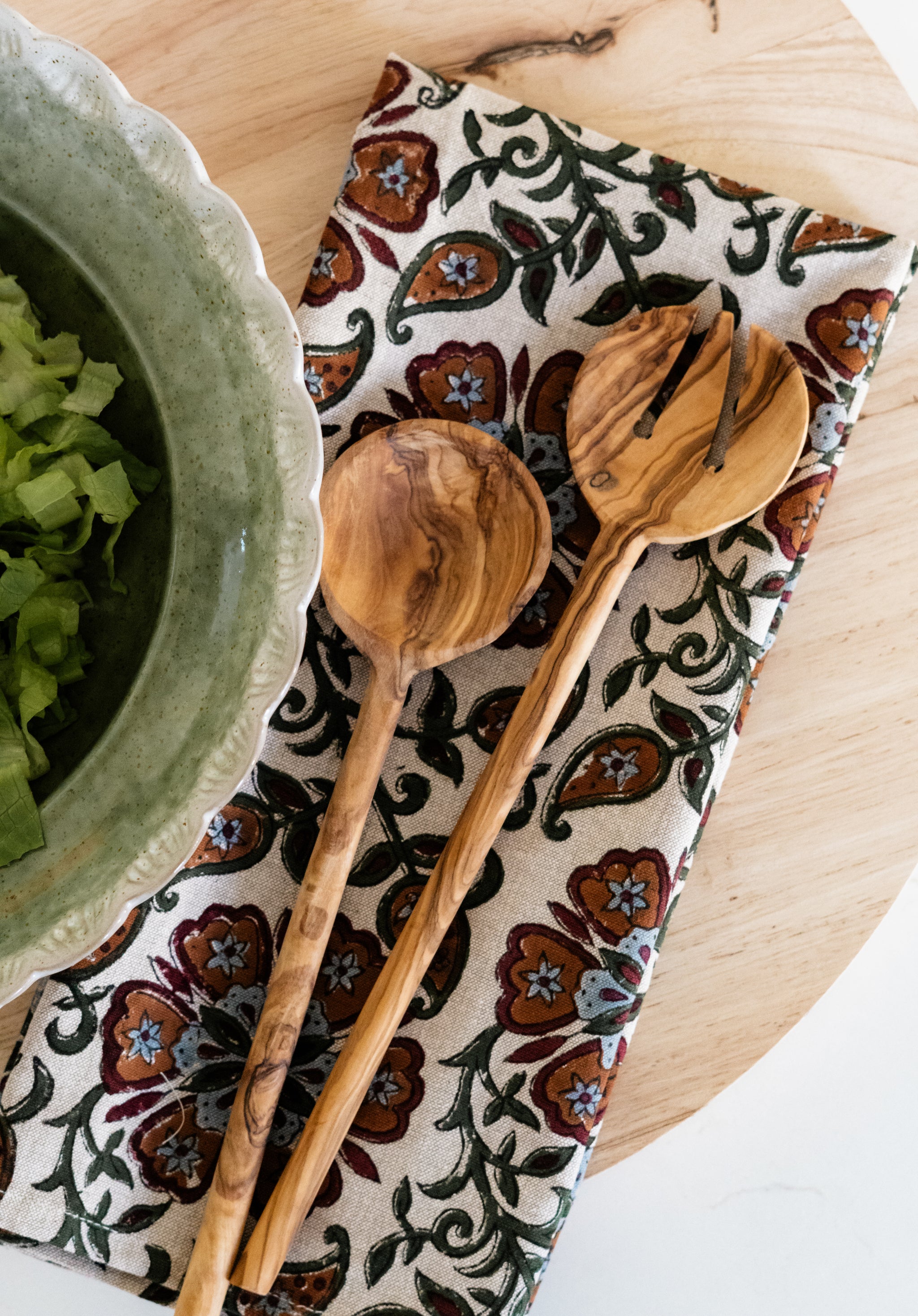 Dense in texture and rich in tone, this Olive Wood Salad servers set brings warmth and enduring appeal of the olive grove to the home. These servers are handcrafted, richly grained, and made from sustainable olive wood from branches that no longer bear fruit. Suitable to use with all kinds of cookware finishes including non-stick.