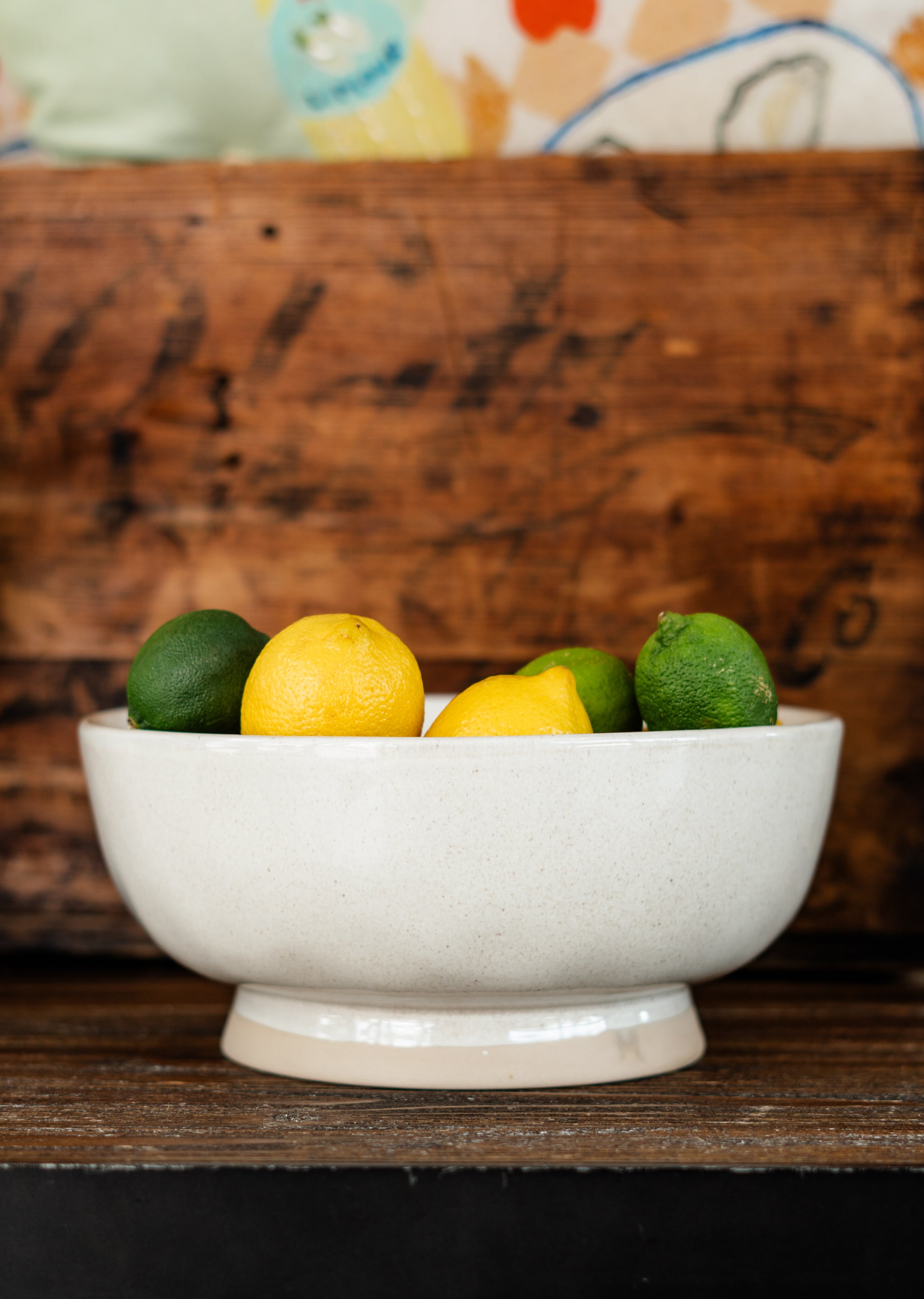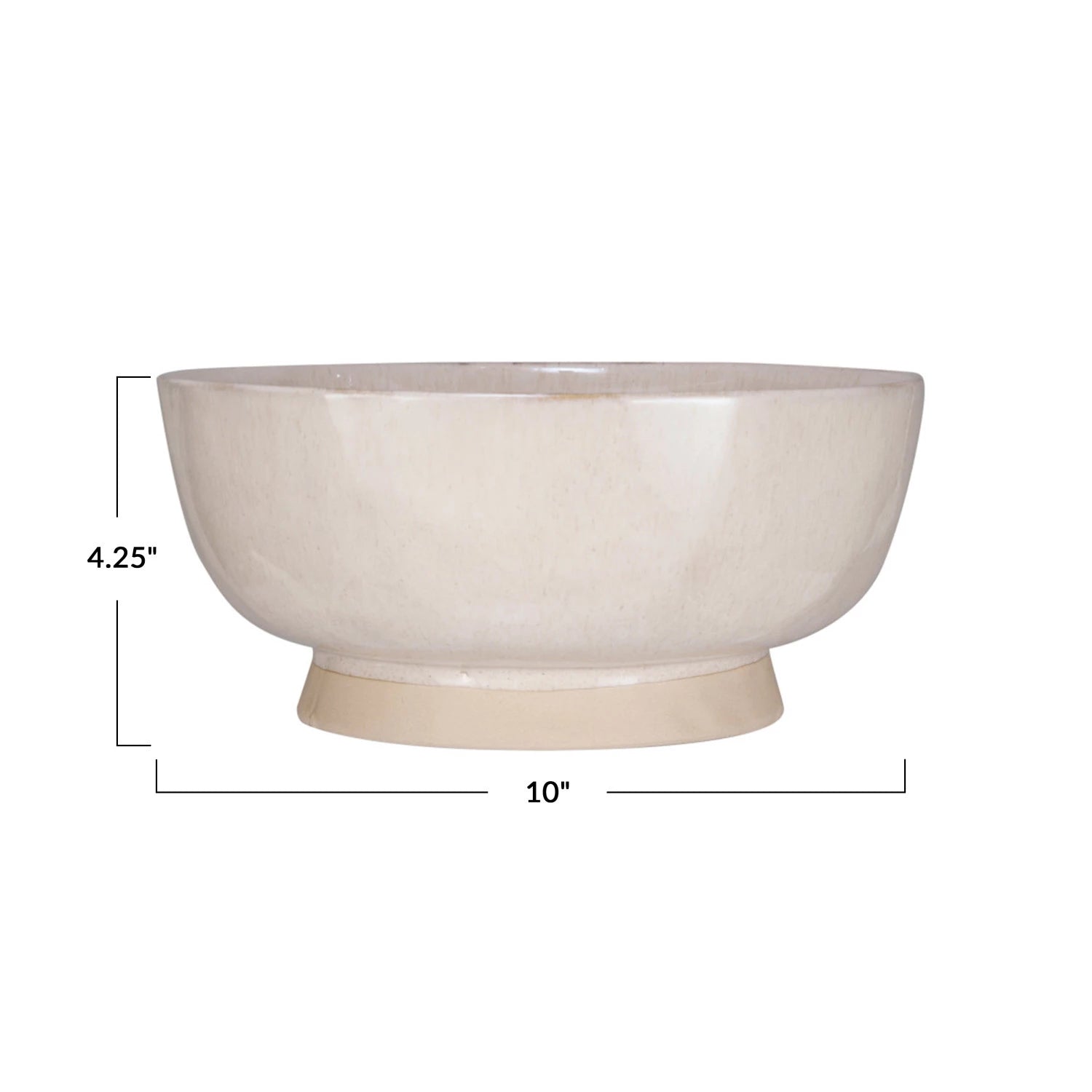 This stoneware bowl is a simple and elegant piece that can enhance the kitchen and dining experience. It has a round shape that can hold a generous amount of food or other items, and a cream color that can match any table setting. The bowl also has a speckled pattern that gives it a subtle and natural look. The bowl is made of stoneware that is durable and easy to clean. It also has a unique character, as each one will vary slightly in color and texture due to the reactive glaze process.