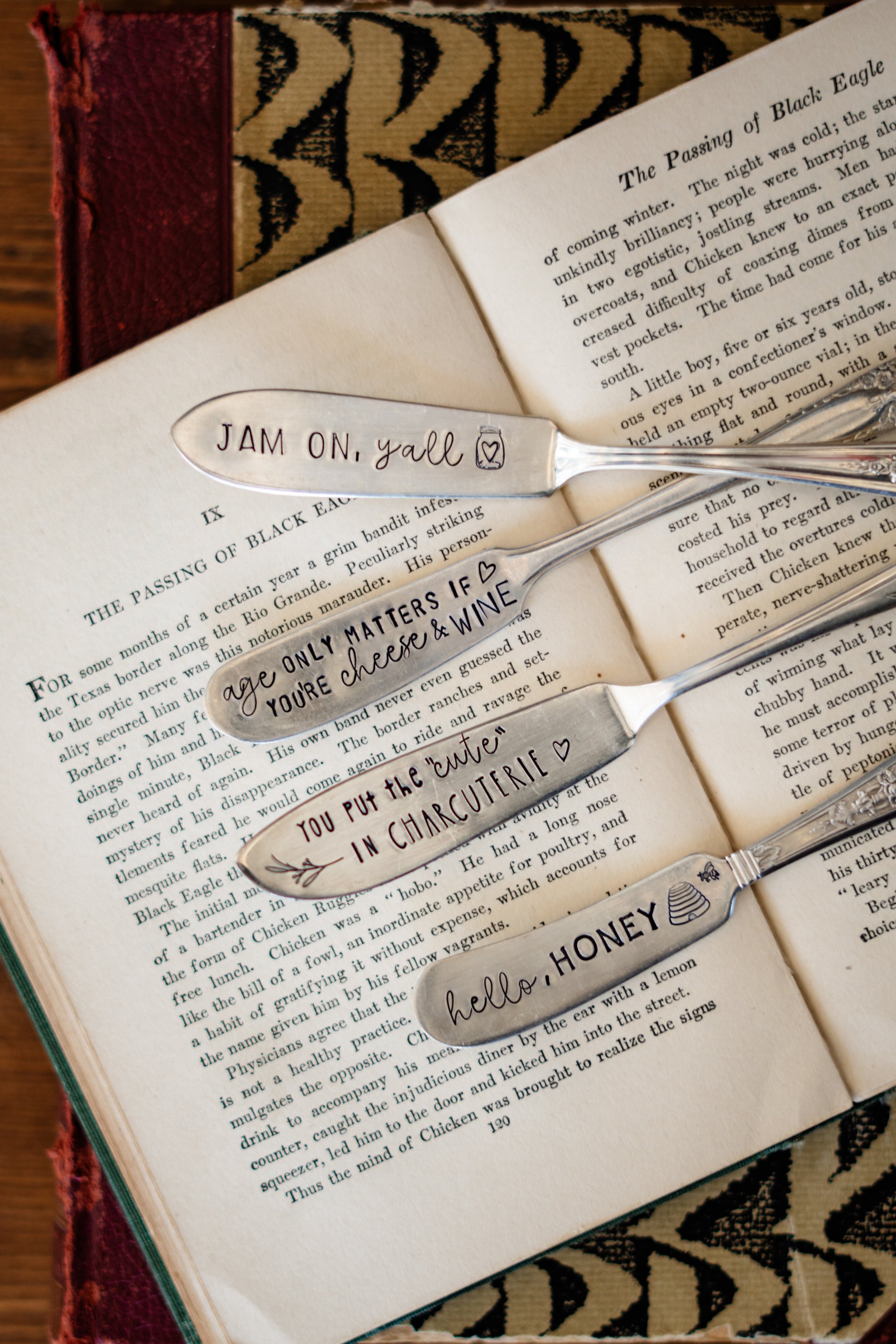 Hand stamped vintage serving spreader, make the perfect gift for yourself or another entertainer this season. Made with love, by Sweet Thyme Design in Lockhart, TX. Due to handmade nature, designs will vary from spreader to spreader.