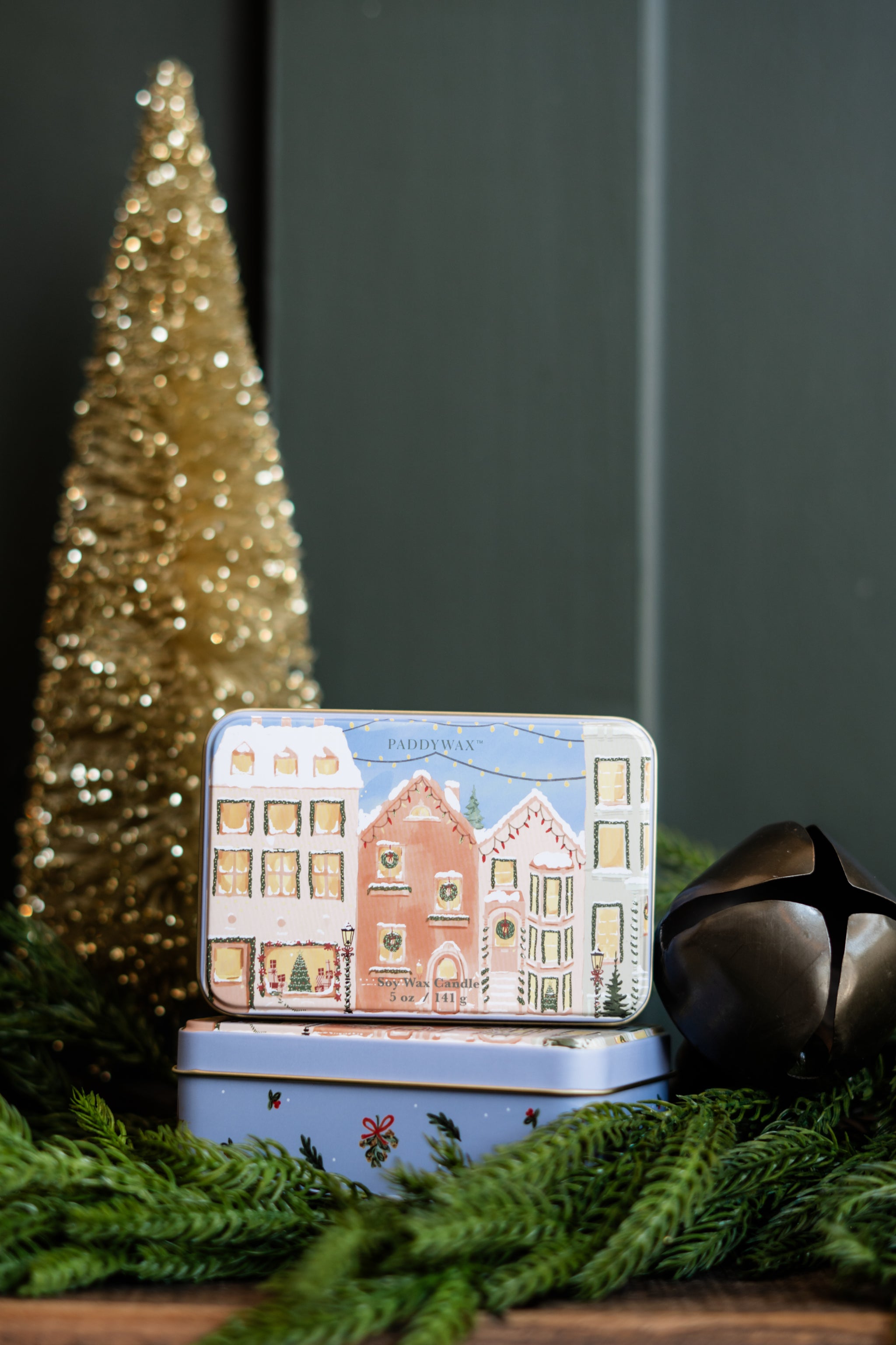 The Paddywax Christmas Village Scene Tin Candle fills your home with the warm, inviting scent of gingerbread. Presented in a 5 oz matte illustrated tin featuring a festive Christmas village scene, it adds holiday charm wherever it’s placed. This candle’s cozy fragrance evokes the comforting aroma of freshly baked gingerbread, perfect for creating a joyful and welcoming atmosphere throughout the season. Its convenient tin design makes it great for holiday gatherings or quiet moments at home.