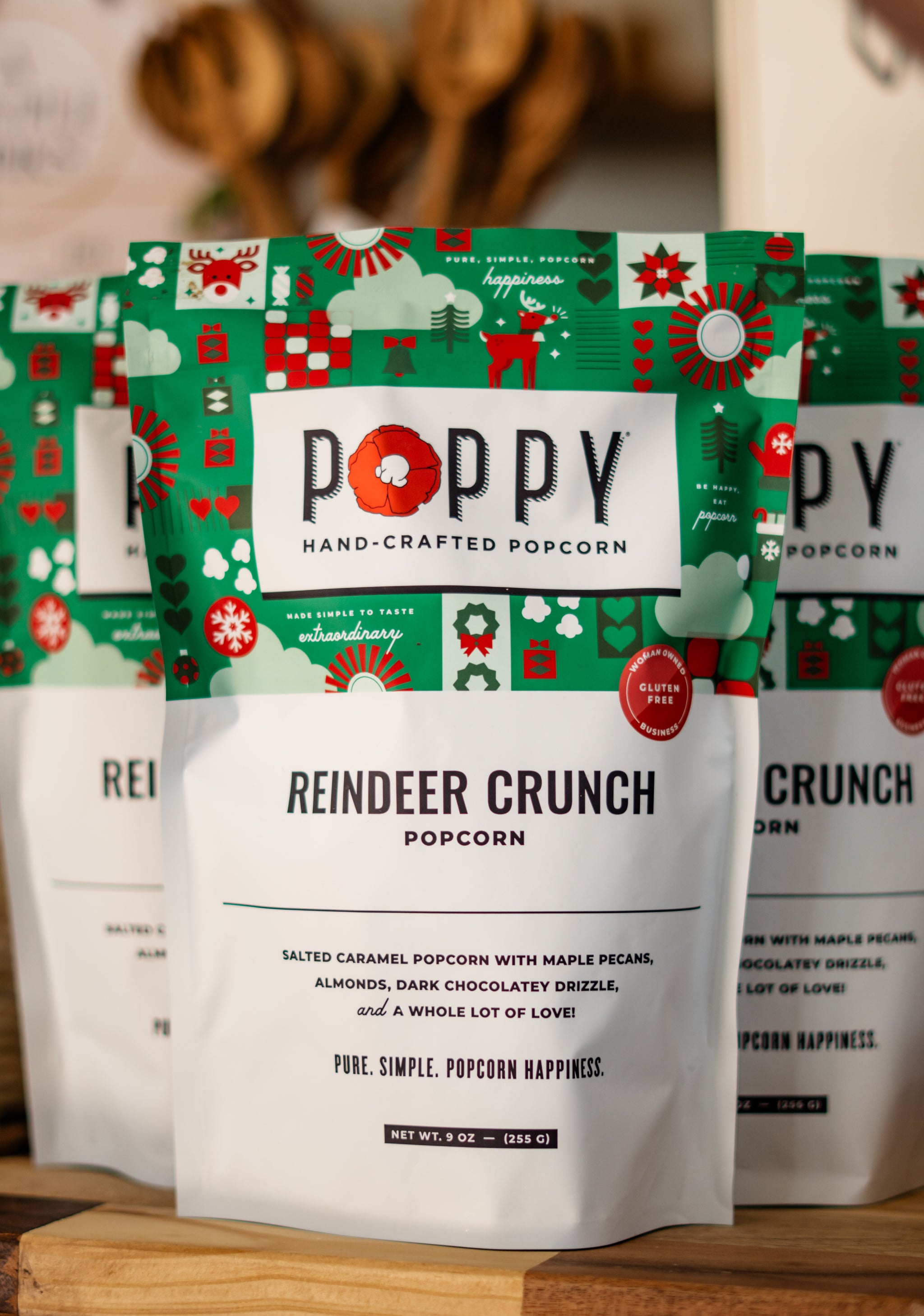 Reindeer Crunch Popcorn | This flavor is sure to get you in the holiday spirit! Our famous Salted Caramel popcorn made with caramelized crushed pecans and almonds, all drizzled with French Broad Chocolate™ craft dark chocolate.