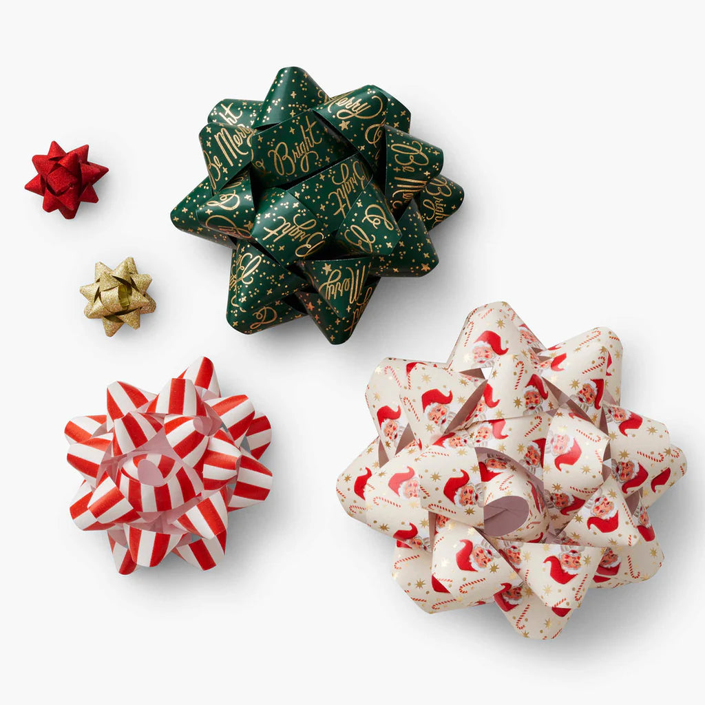 A box full of bows. This set of 18 adhesive bows includes 1 large, 3 medium, 2 small, and 12 tiny bows featuring illustrated designs, metallic accents, and glitter.
