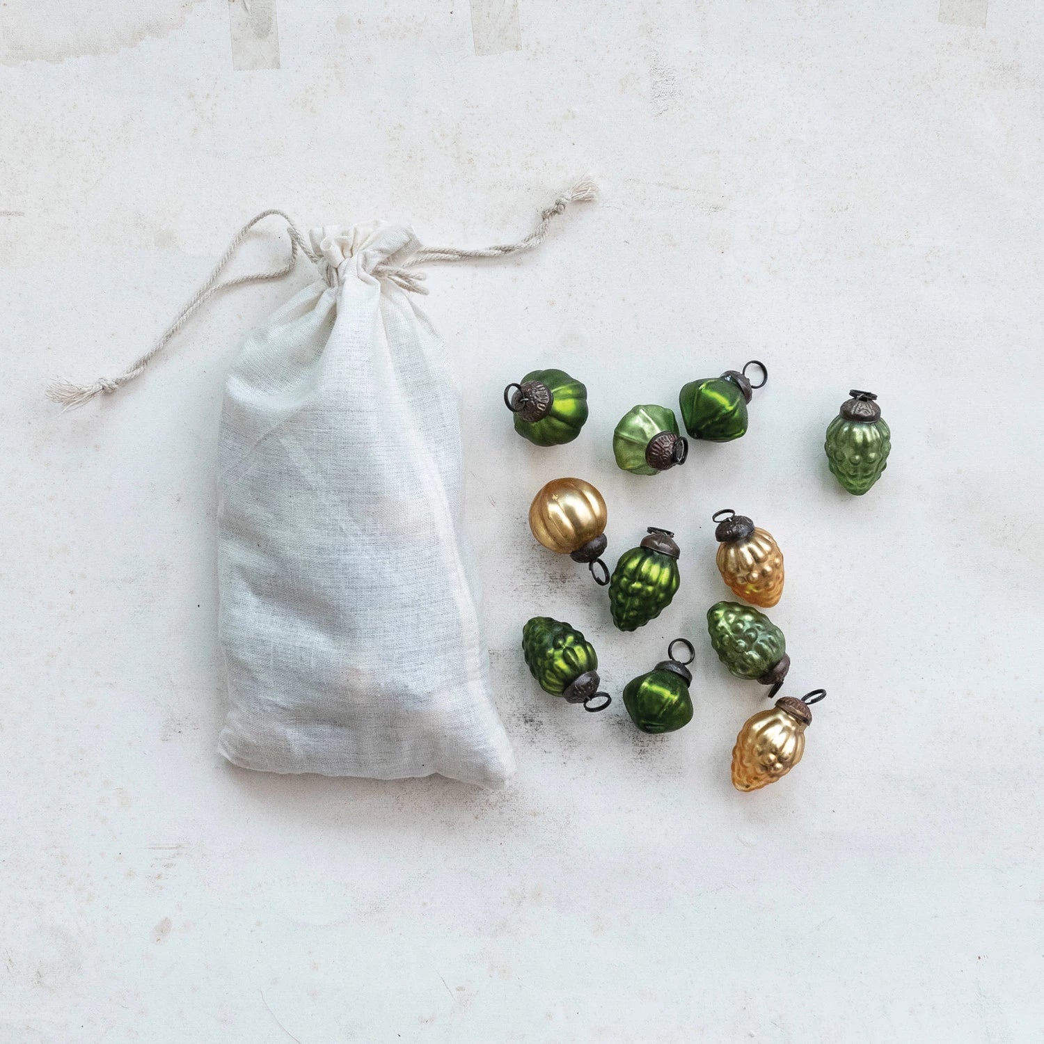 Embossed Green & Gold Mercury Glass Ornaments in Muslin Bag (S/36)