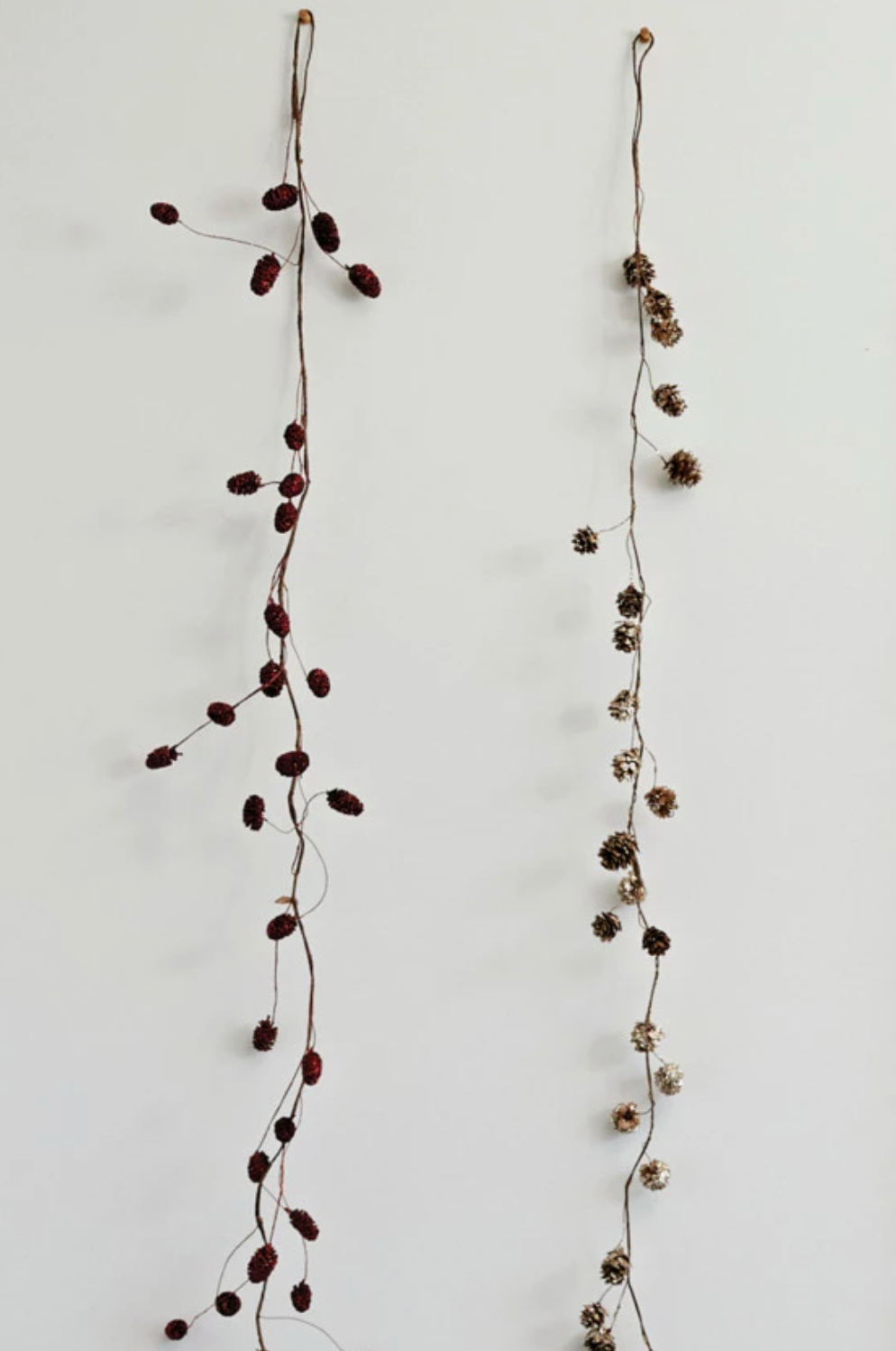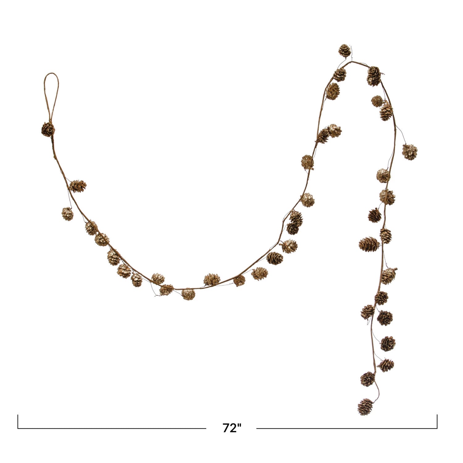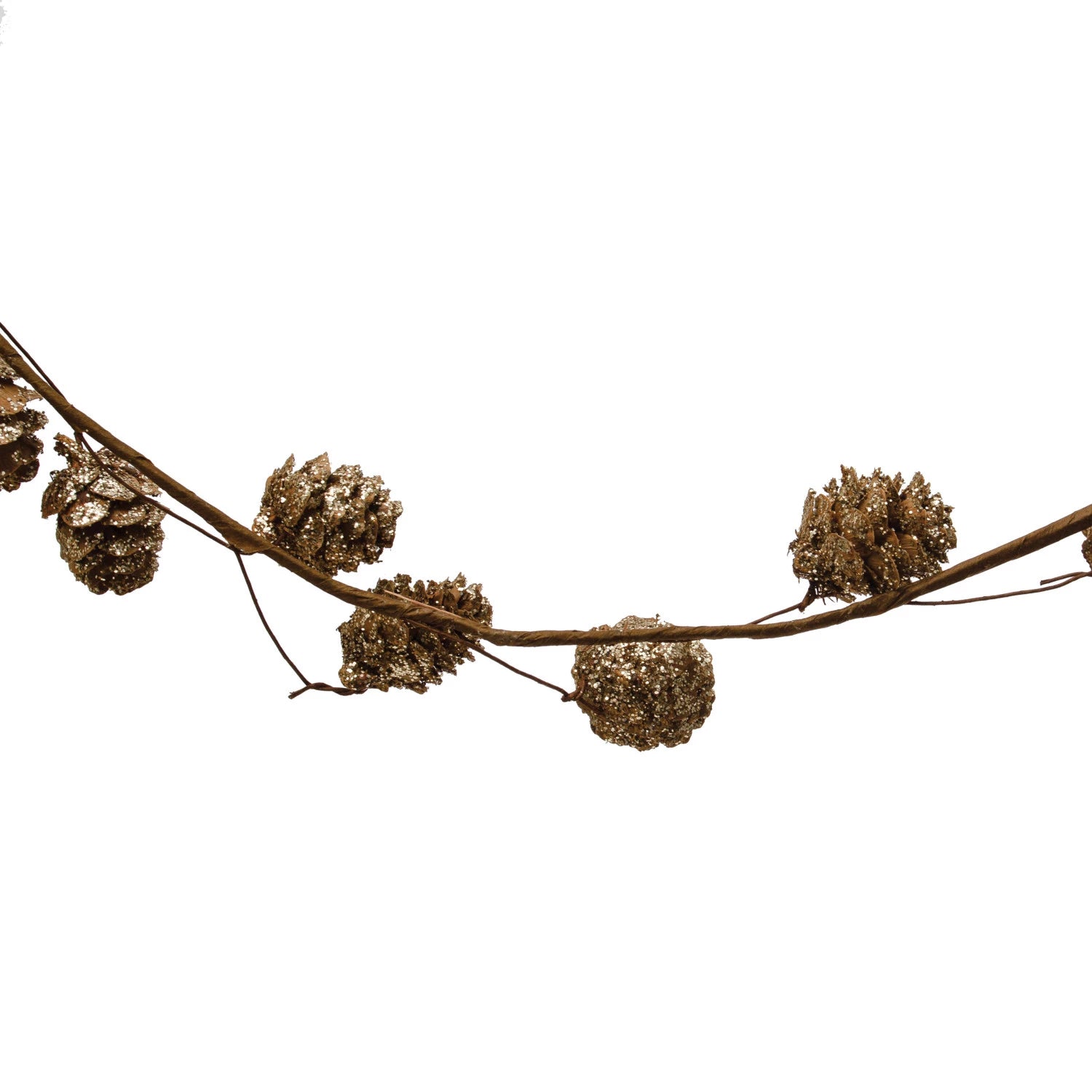 This glamorous garland features multiple sizes of natural pinecones coated in sparkling glitter. Add a touch of festive whimsy to any space with our enchanting collection of garlands, including stunning glass, sleek metal, and delightful mixed-material options, all expertly crafted to create a merry and bright atmosphere. 72"L Natural Pinecone Garland w/ Gold Glitter, Natural.