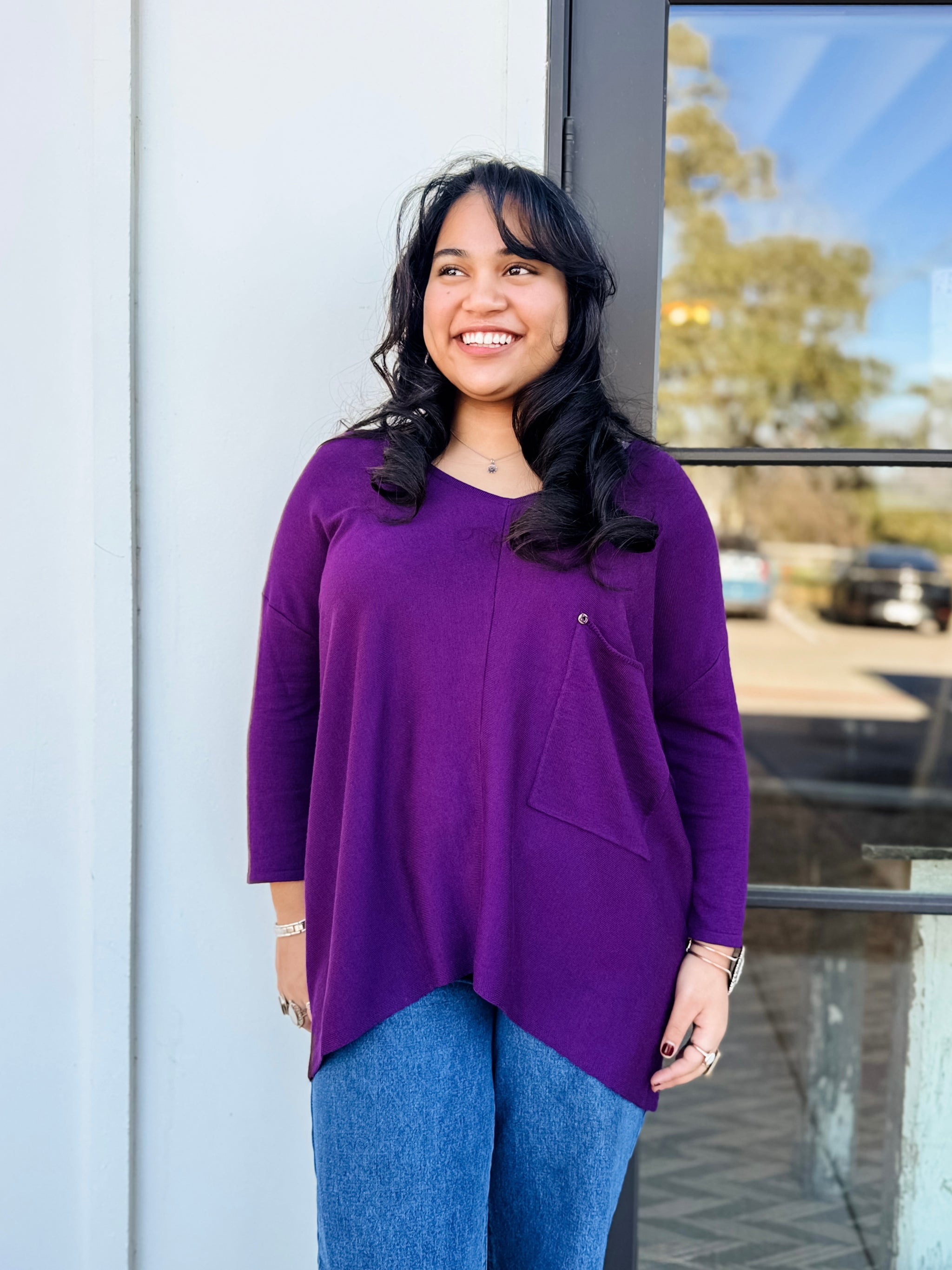 Year after year, this is our bestselling top. This ultra-soft, lightweight sweater made from fine mercerized wool has been one of Kerisma's top sellers since day one. Featuring an oversized pocket and a center seam detail, the Raven Top will become your go-to piece and the perfect foundation for ANY outfit. Center-seamed 3/4 sleeve v-neck top with chest pocket and brass accent buttons. We recommend sizing up for an oversized look.