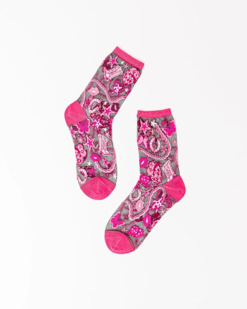 Barbie meets cowgirl aesthetic in our disco-inspired, black sheer sock that will make you the life of the party! Features girly pink elements of butterflies, lips, and stars, combined with cowgirl boots and hats, disco balls, and horseshoes. Finished with a glittery pink cuff, heel and toe for the ultimate party accessory. One Size. Recommended fit US W5.5-10. 200 Needle Count.