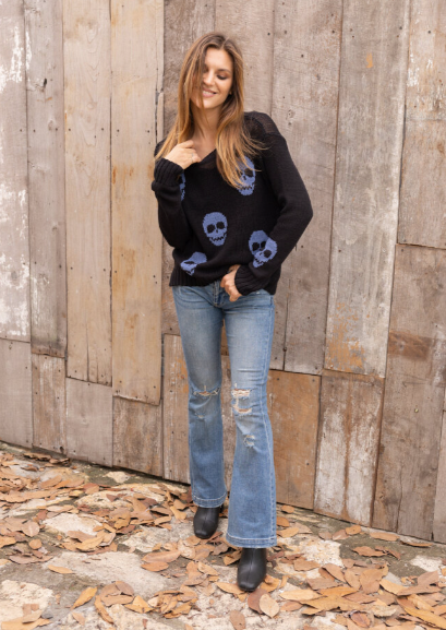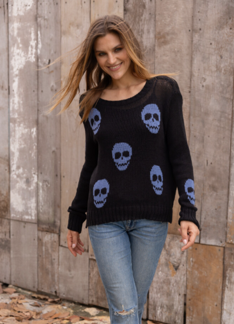 Buttery soft and incredibly cozy, this comfy top features skull graphics knit directly into the sweater throughout the body and sleeves. The fit is relaxed and flattering, with mini side slits. Cozy details include ribbing on the neckline, hem, and cuffs.