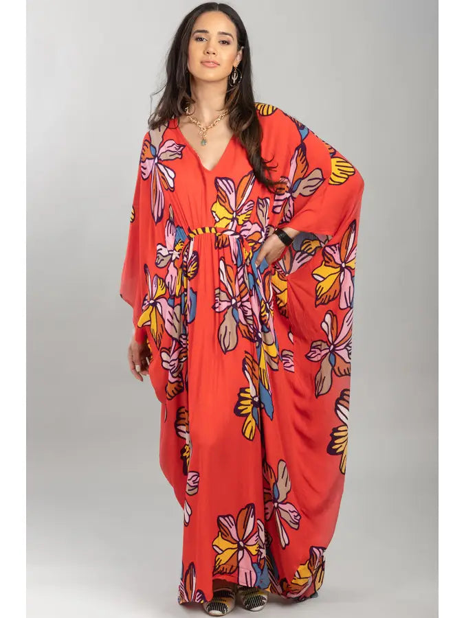 Turn heads in our tropical, short-sleeve caftan! Hot pink and bright orange hues pair with bold floral designs for a unique, summery look. This kaftan’s lightweight fabric shapes a flattering V-neckline, short kimono sleeves, and a surplice bodice. Pair with sandals and a tote for a chic resort style or a vibrant summer look.