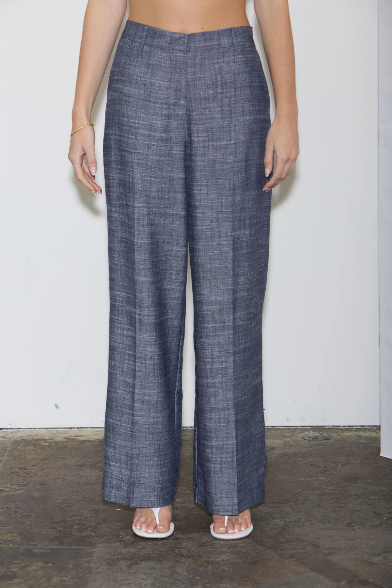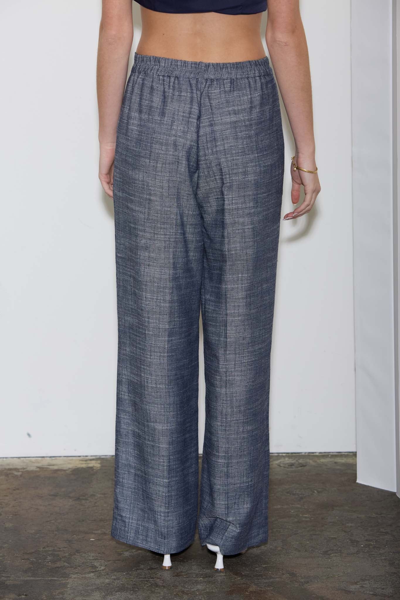 The Devyn Elastic Denim Pant features a high-waist silhouette with belt loops, front zipper, and hook & bar closure for a secure fit. Designed with a straight leg and front crease detail, this pant offers a polished, structured look. Crafted from a breathable linen blend (47% rayon, 38% polyester, 15% linen), it's unlined for lightweight comfort. Pair with the matching vest for an effortless, coordinated ensemble.