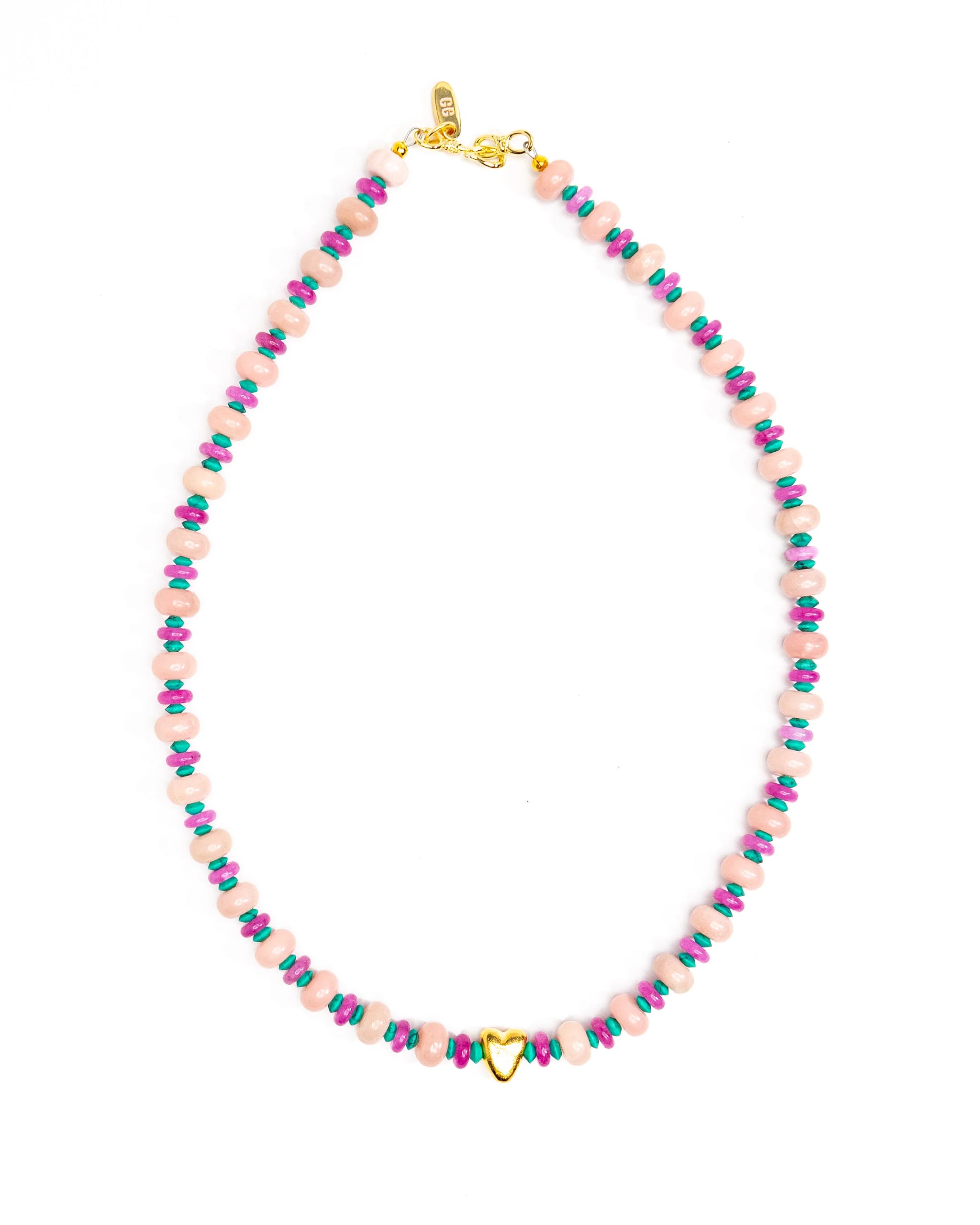 Gold heart mixed with pink opal and Ethiopian teal and fuchsia spacers. Measures approximately 18" long.
