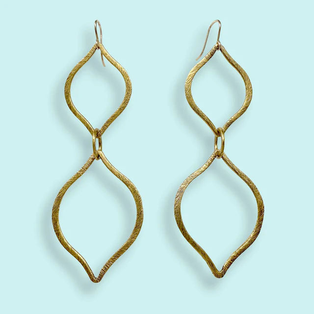Bold antique-gold dangle earrings inspired by retro 1960s style. With two stacked ogee shapes, these mid-century earrings bring a sculptural, vintage-inspired silhouette to your look. Lightweight yet eye-catching, they’re the perfect pair of statement earrings for boho style lovers and anyone drawn to timeless, artistic design. They’re finished with 14k gold-filled, nickel-free earwires for lasting comfort.