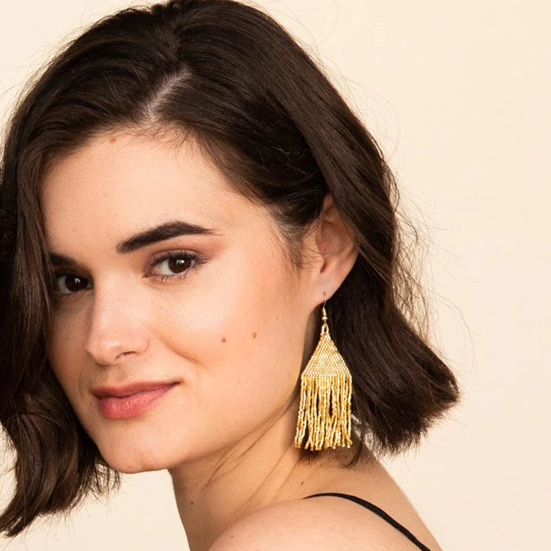 Part of our luxe collection accessories, the luxe petite fringe earring is hand crafted by artisans in India. Delicate glass beads with an elegant shimmer are woven for a luminous, lightweight and effortlessly cool beaded statement accessory. 3.25" - Made By Artisans In India - Glass Beads.