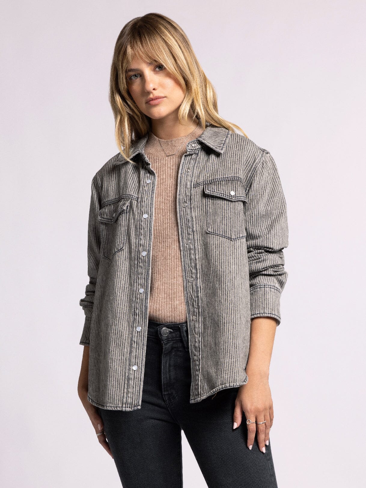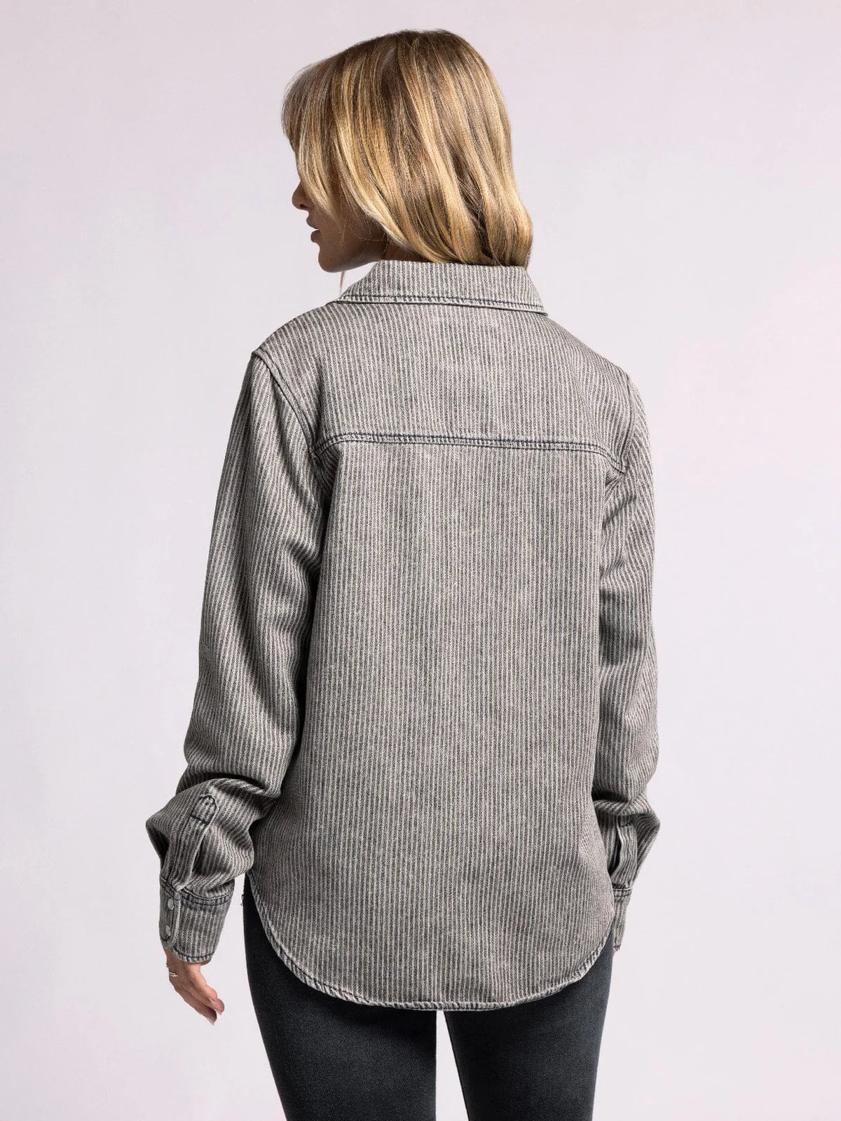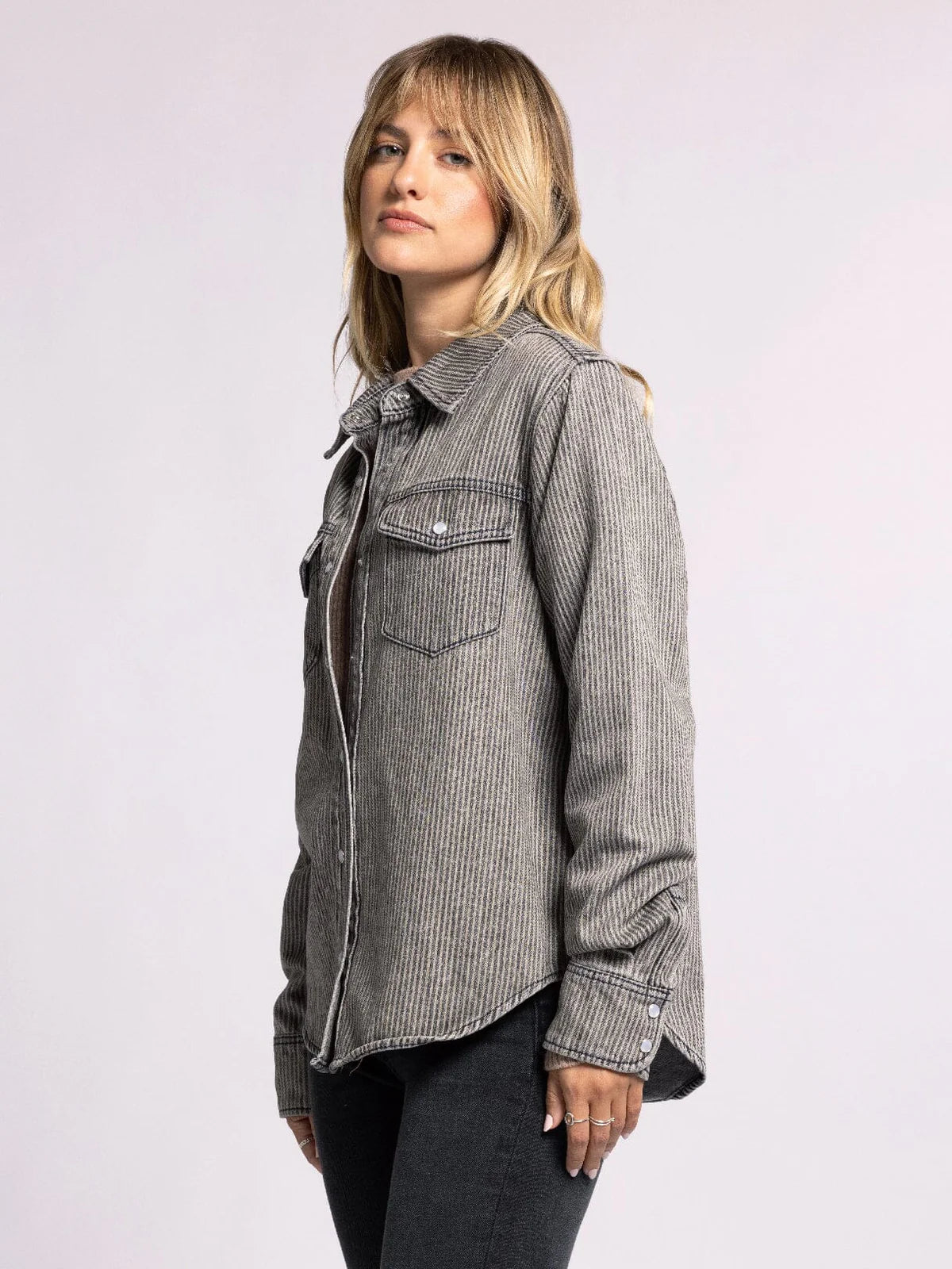 Perfect for a Texas Fall & Winter, The Pippin Stripe Pearl Snap Jacket delivers style and practicality in one standout piece. Its collared neckline provides a refined silhouette, while the button front closure lets you adjust warmth on the fly. The shirt tail hem offers versatility—wear it loose for a relaxed vibe or tuck it in for a more structured look. Bold striping, making it an instant favorite for layering through unpredictable seasons and casual everyday wear.