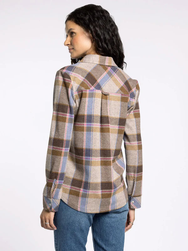The Cassian Sand Plaid Top features a classic collared neckline and a convenient button front closure. With dual chest pockets and a shirt tail hem, it combines style with practicality. Its lightweight fabric makes it an excellent choice for layering, adding warmth without bulk as the seasons change.