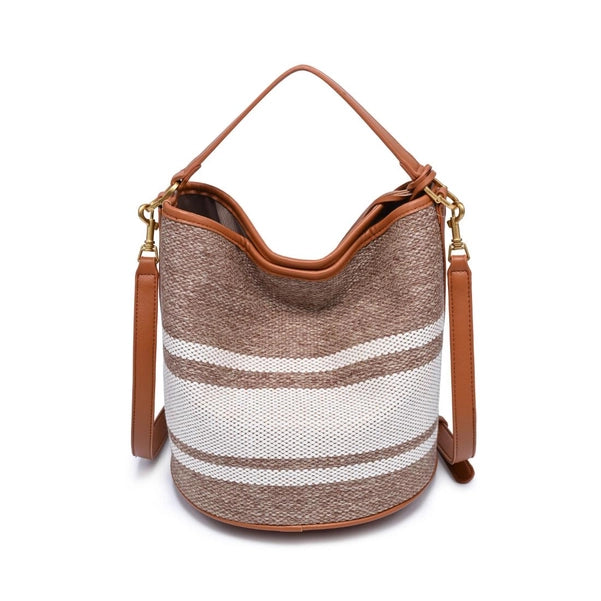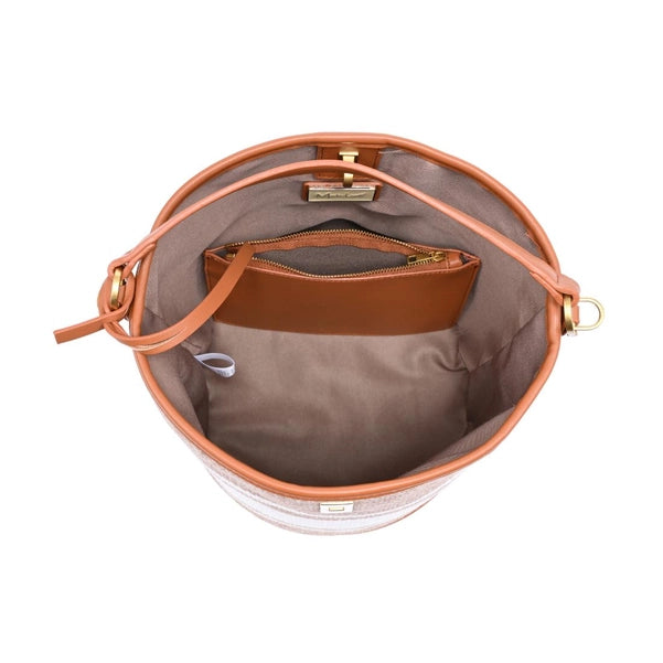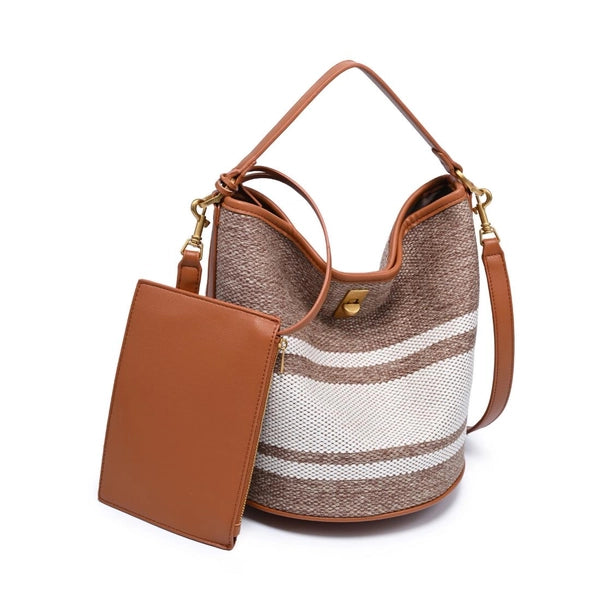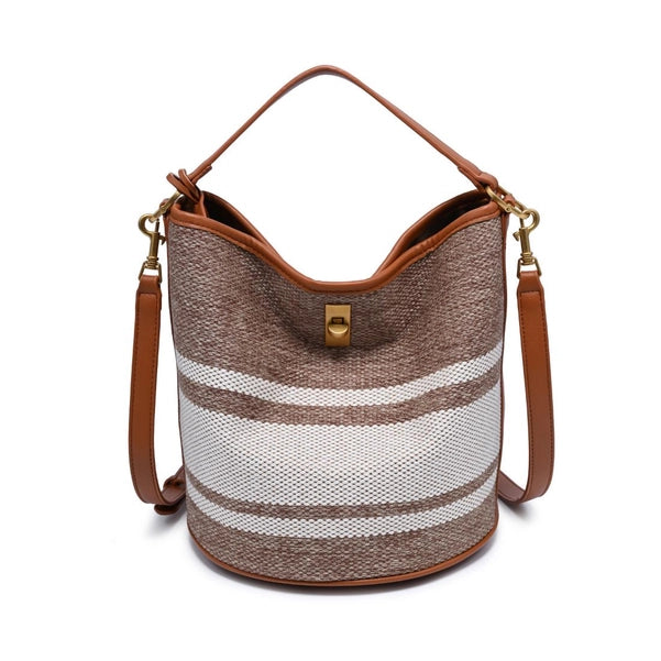 Mirella Bucket — a textured woven bucket silhouette with smooth trim. Textured woven body, structured base, secure metal clasp, top handle plus adjustable, detachable shoulder strap, and removable zip pouch for essentials. Spacious yet lightweight, effortless day-to-night utility. Modern, versatile and refined—perfect for trend-aware women seeking polished function in a single, statement-ready bucket bag. *Item Type: Bucket *Material: Polyester *Closure: Gold-tone turn-lock clasp secures the top opening for quick one-handed access and keeps contents contained when carried or set down. *Exterior Details: Woven textured fabric with horizontal stripes, leather-trimmed rim and base, detachable shoulder strap with swivel hooks and rounded bottom for stable placement. *Interior Details: Single unstructured main compartment lined in soft fabric, featuring an attached zippered pouch for valuables and ample open space for daily essentials.