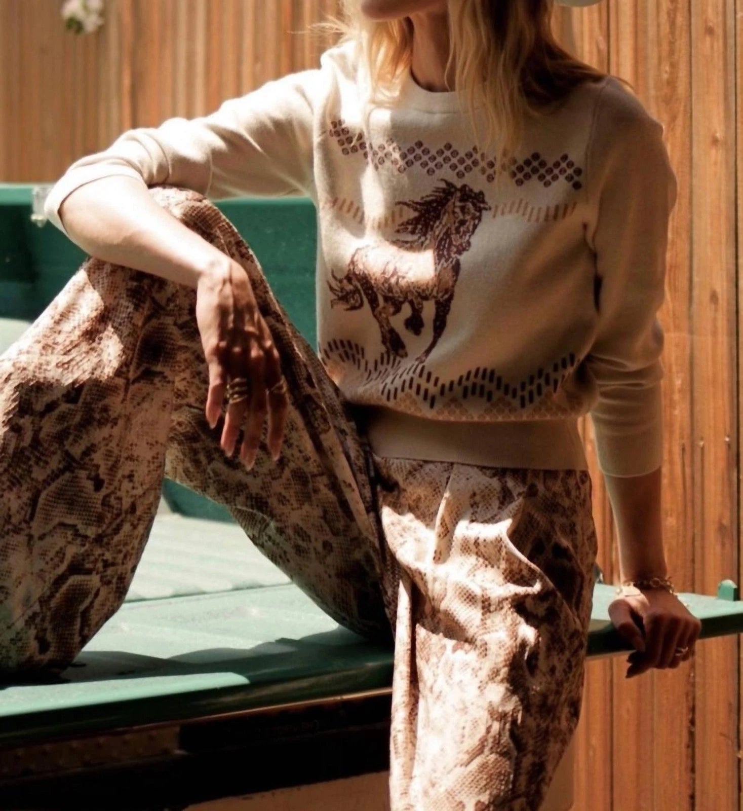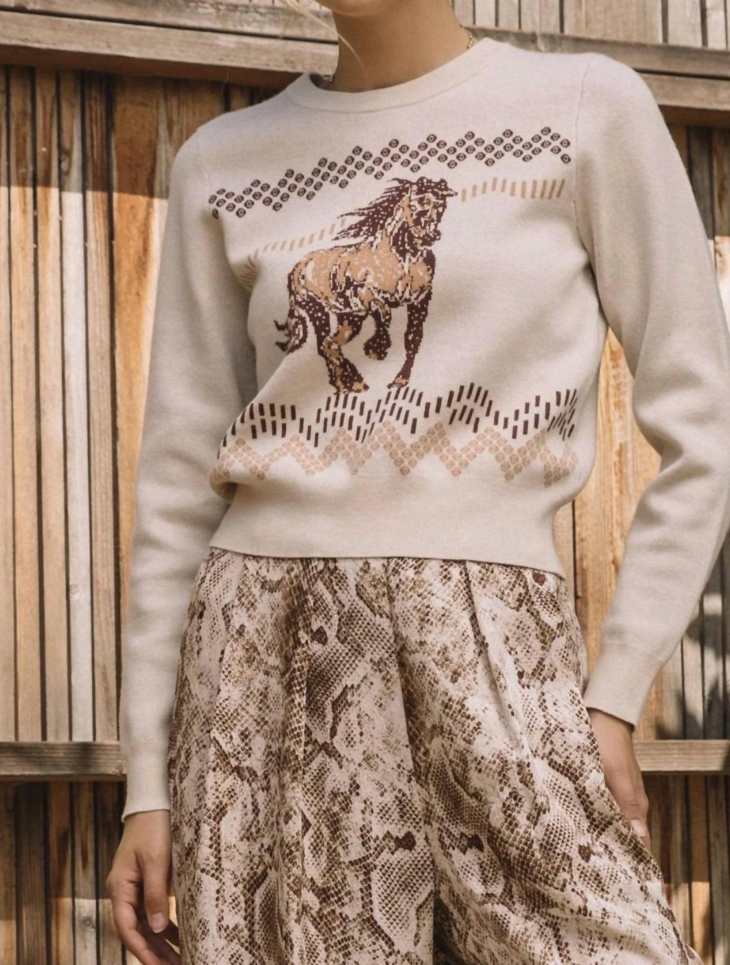 Experience the perfect blend of comfort and style with this trendy crew neck sweater, designed to effortlessly elevate your wardrobe. Pair it with your favorite denim and loafers for the perfect look. Bring a little wild to your wardrobe with this horse pattern western sweater—where cozy comfort meets cowgirl chic. Perfect for rodeo nights, ranch days, or simply layering western flair into your everyday style. Details Soft knit fabric with subtle stretch Neutral cream base with bold horse motif Western-inspired geometric pattern Crew neckline and fitted long sleeves.